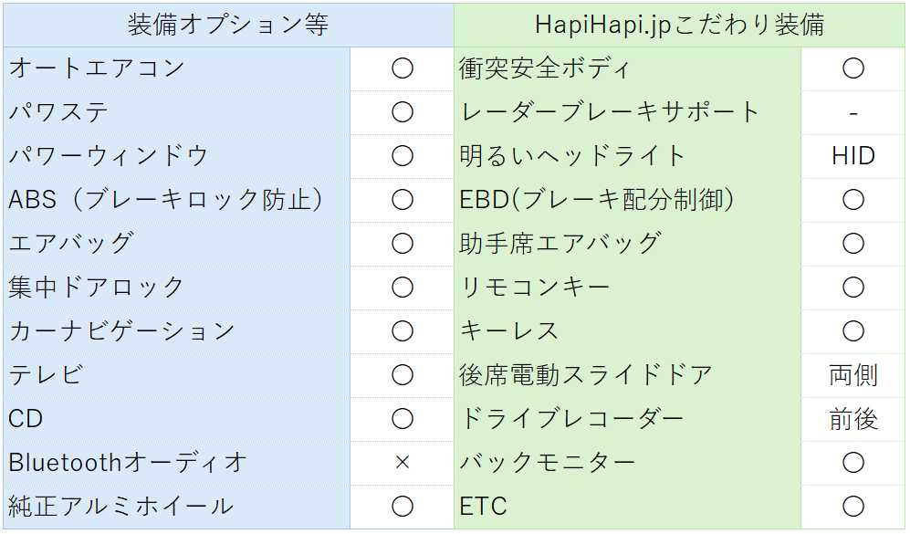 こだわり装備についても、KENWOOD製の前後録画ドラレコやバックモニター、両側電動スライドドアなど、充実した装備です(詳細は下の表)。